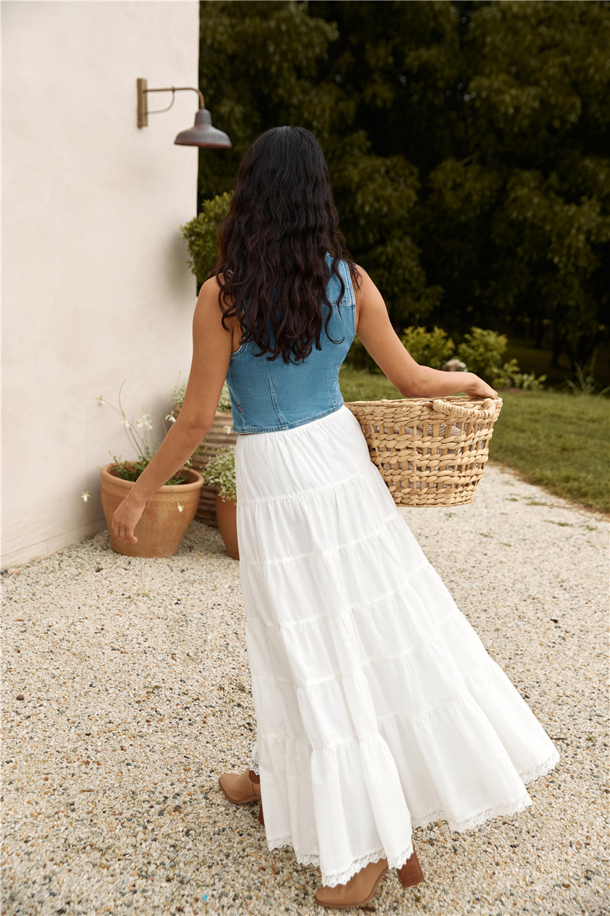 The CHARLIE HOLIDAY Poppy Maxi Skirt in White is the perfect summer staple to add to your wardrobe. Filled with whimsy and feminine energy, this skirt pairs well with a white tank top or the matching CHARLIE HOLIDAY Poppy Top in White.