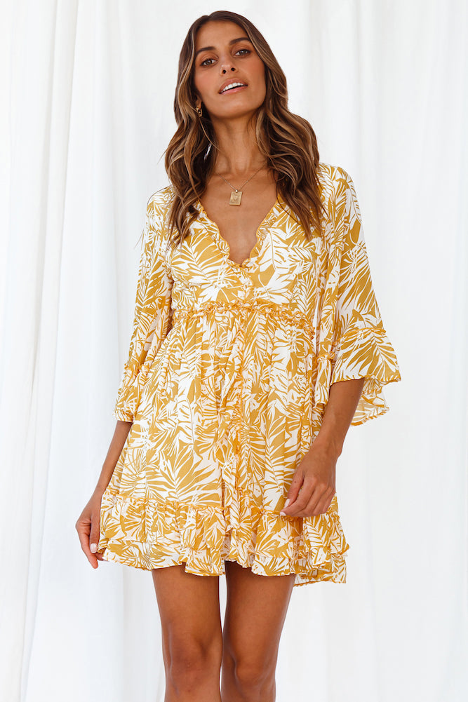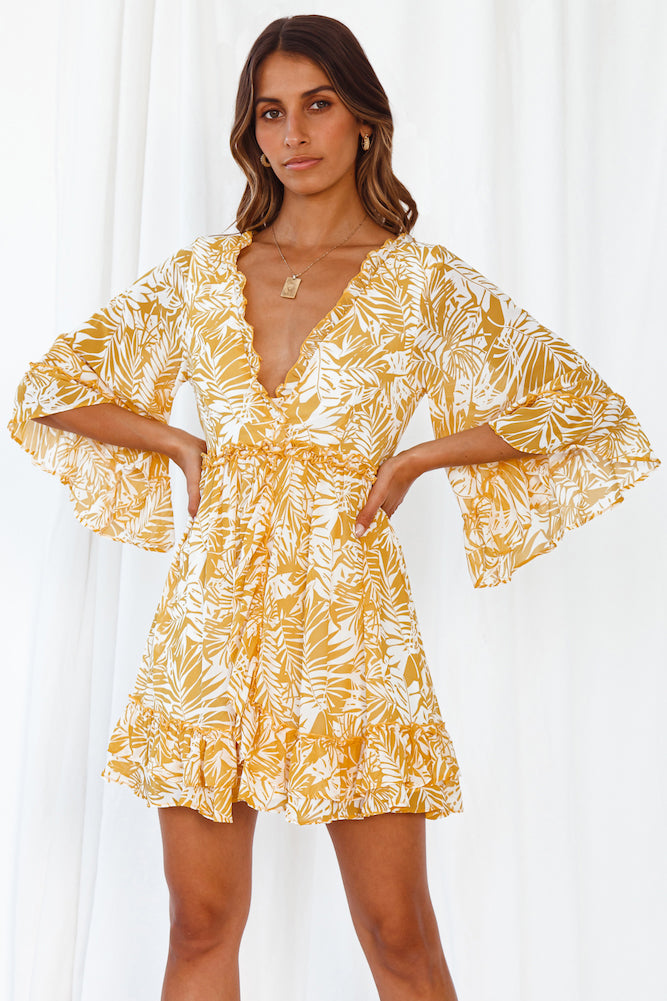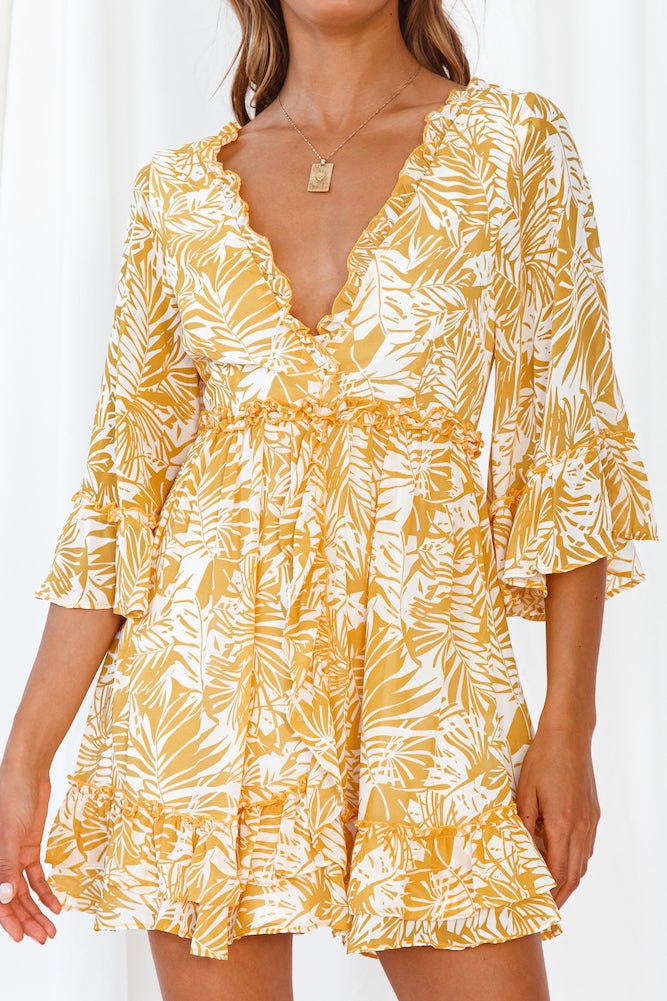 Always say yes to new adventures when wearing our Take My Breath Away Dress! Edged with frills, your whimsical mini dress teams best with tan slides and basket-woven accessories.