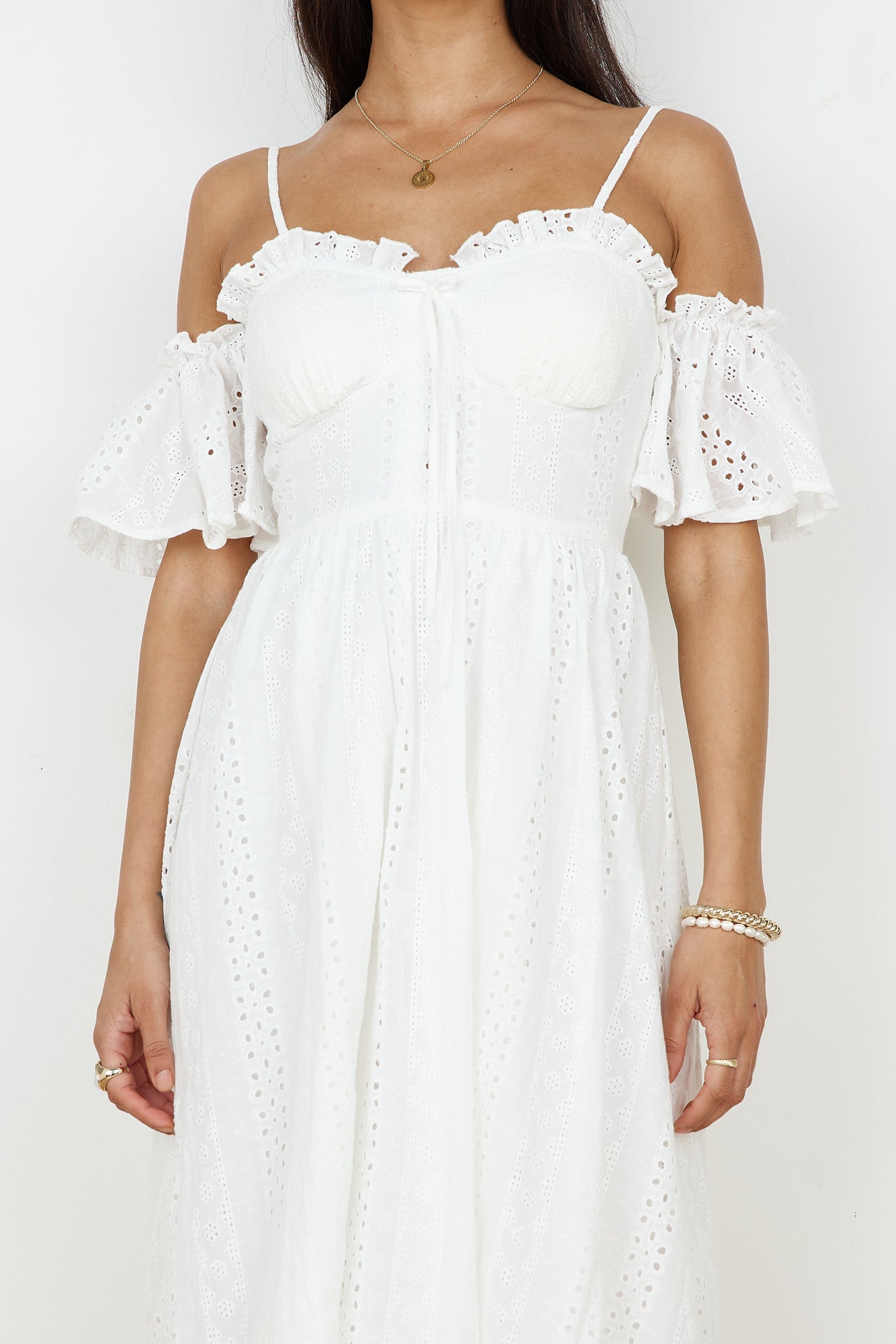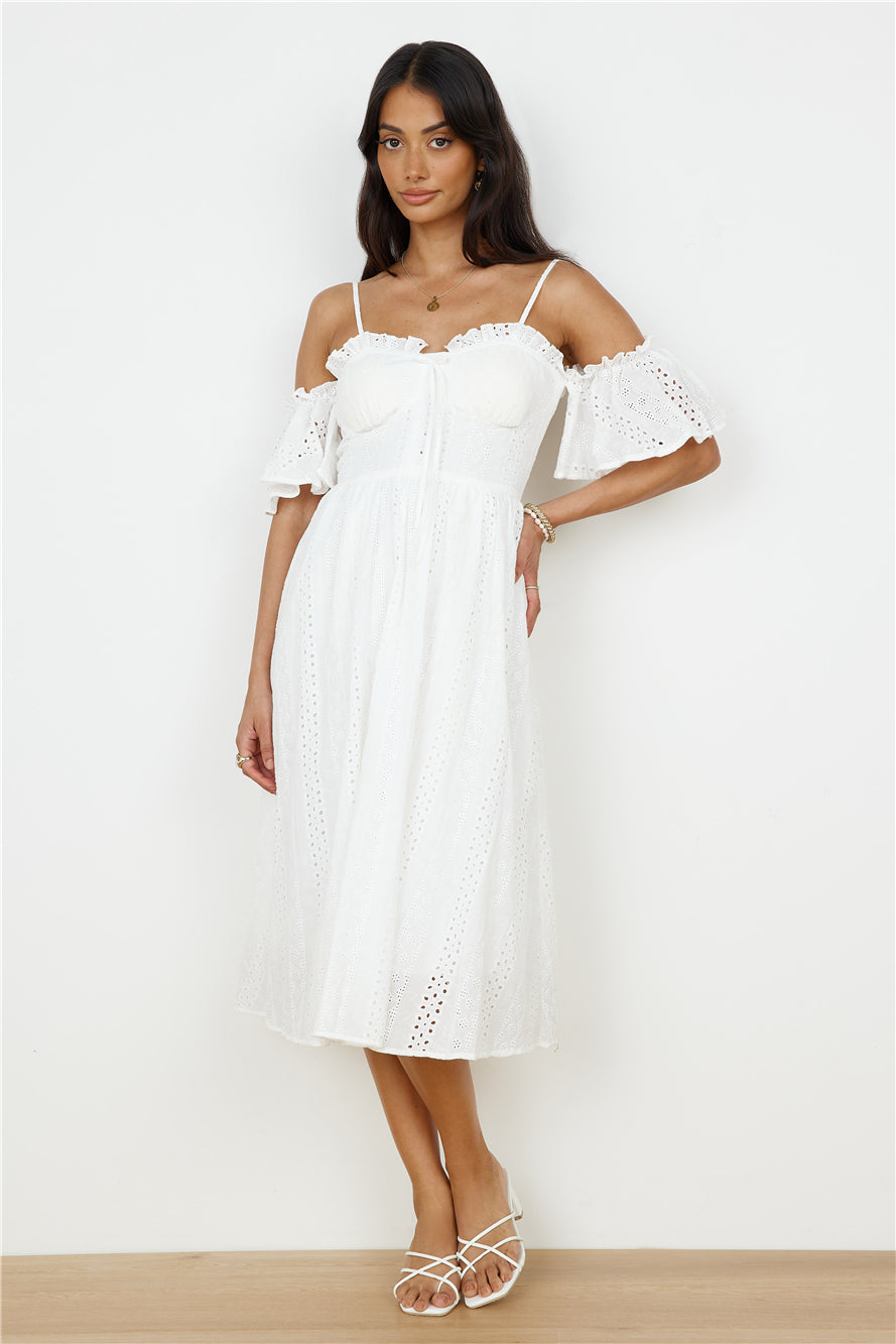 Travel to the rustic streets of an Arabian city in our Basque Midi Dress! This breezy luxe lace dress styles with sparkling gold adornments and jute wedges.