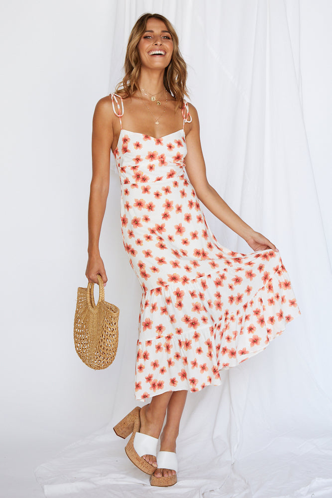 Our Floral Scene Midi Dress was made for your tropical vacay! Style yours with slides and a woven bag.