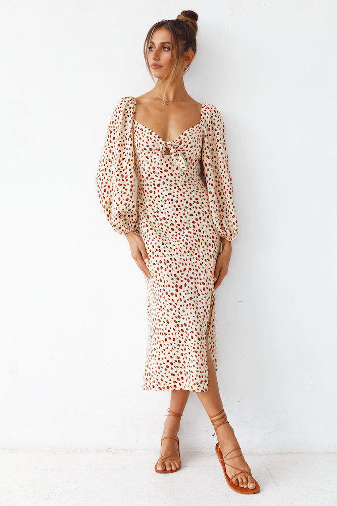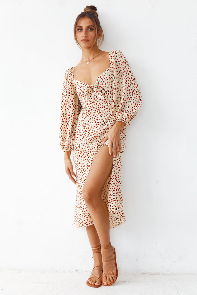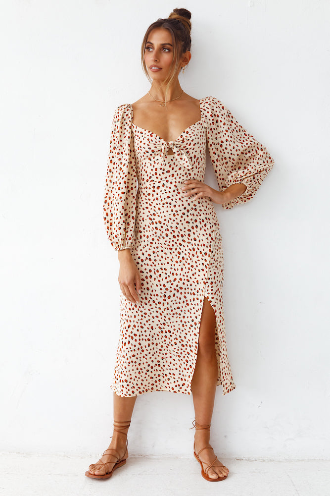 The Mereol Maxi Dress is a sweet cottagecore style that features the tenacity of nature. Style yours with lace-up sandals and gold adornments.