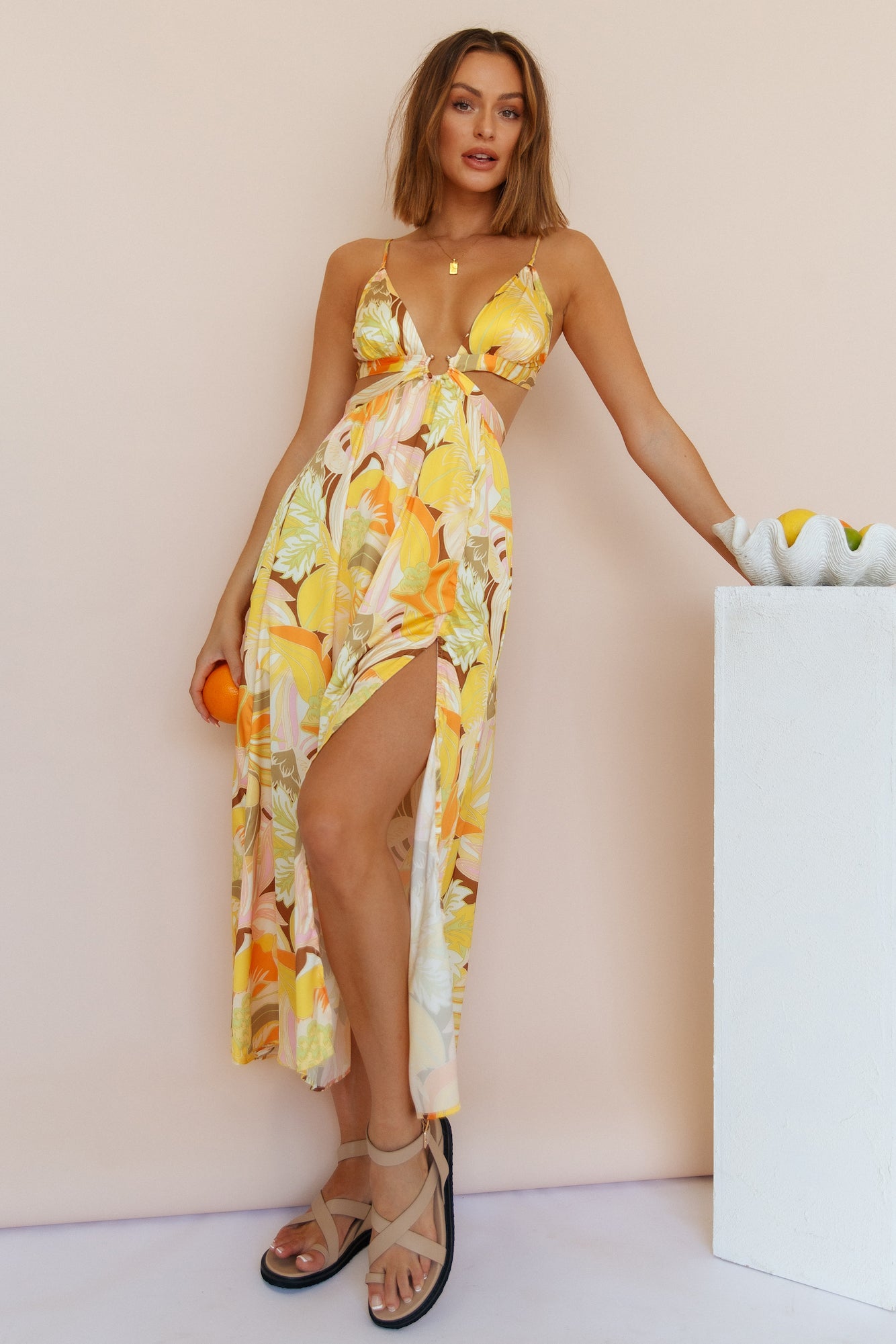 The Through The Gardens Maxi Dress is perfect for rooftop sunsets and celebrating the good things in life. Style yours with sunkissed skin and neutral block heels!